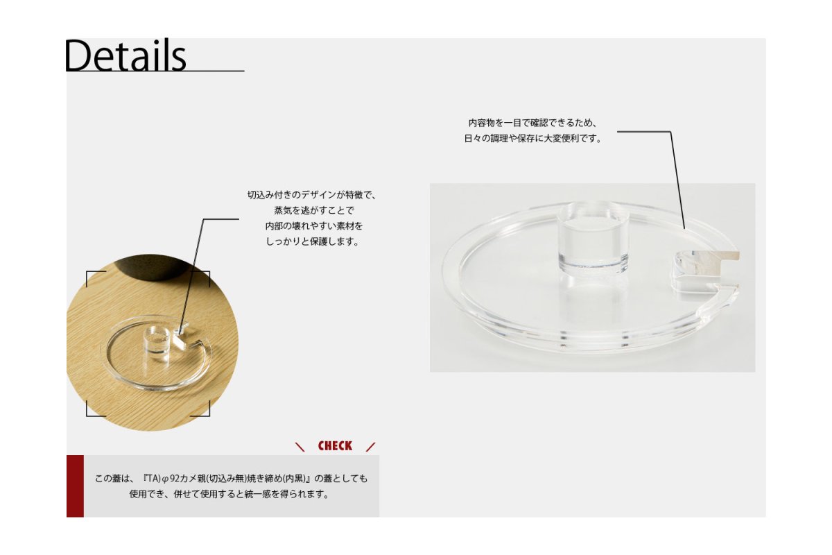 この蓋は、『TA)φ92カメ親(切込み無)焼き締め(内黒)』の蓋としても使用でき、併せて使用すると統一感を得られます。