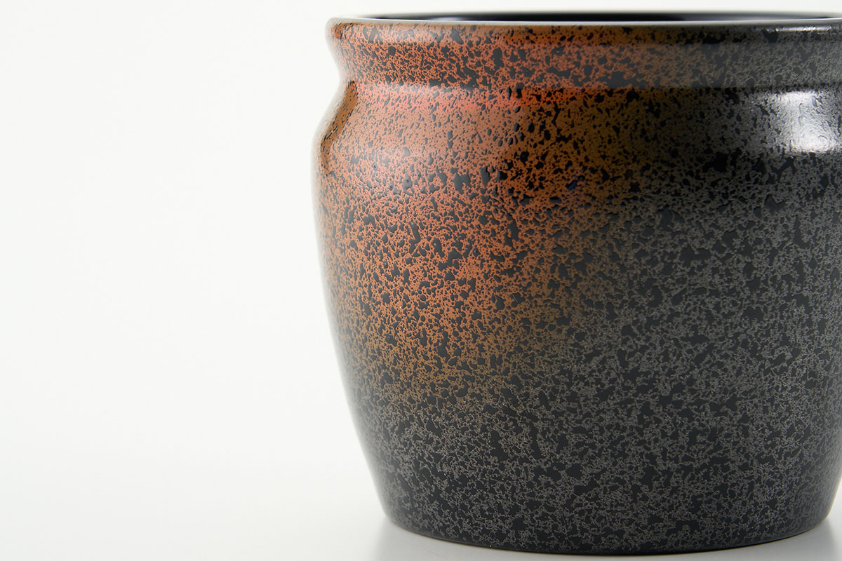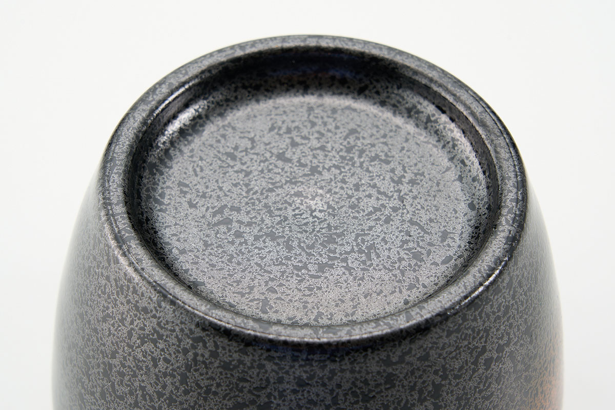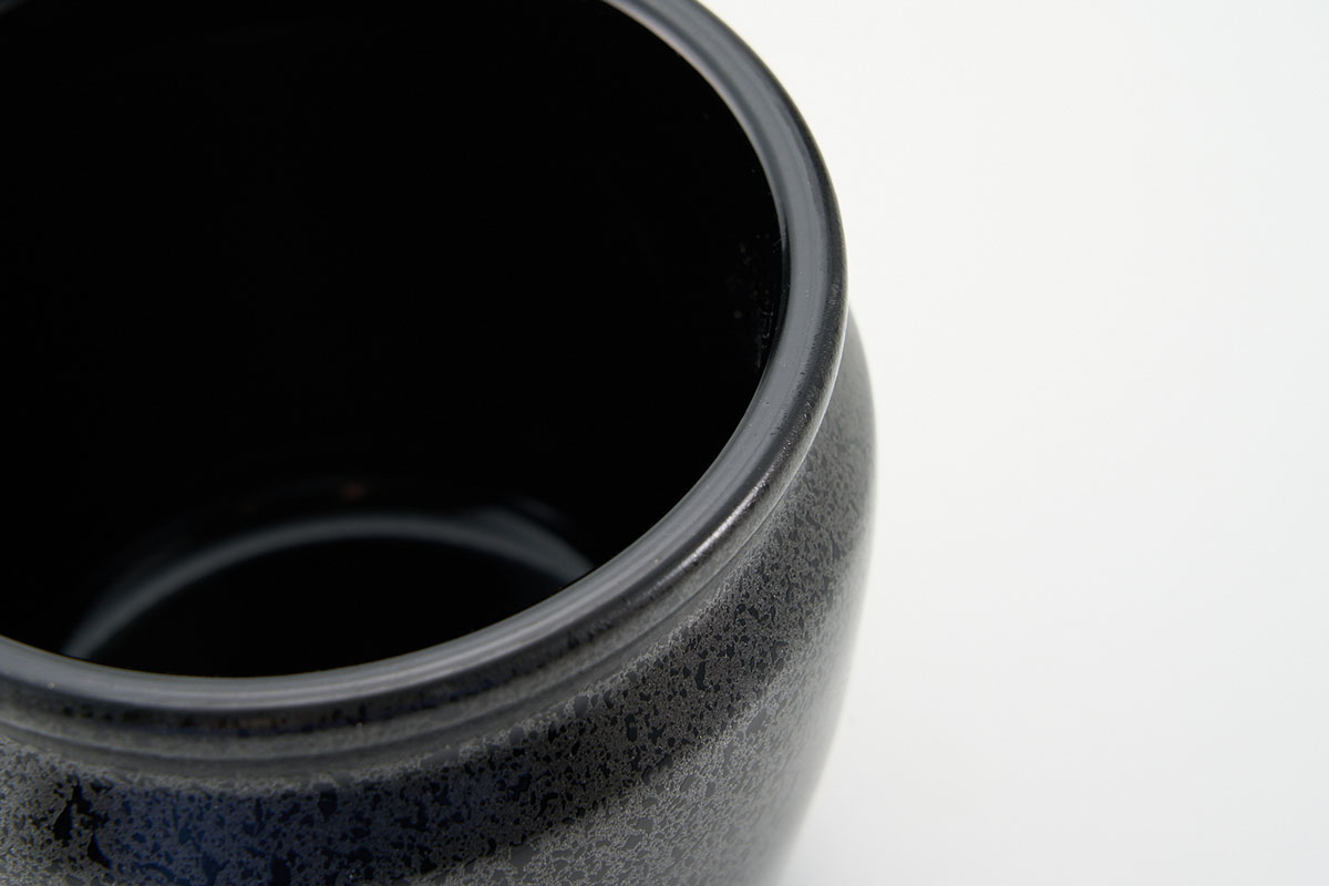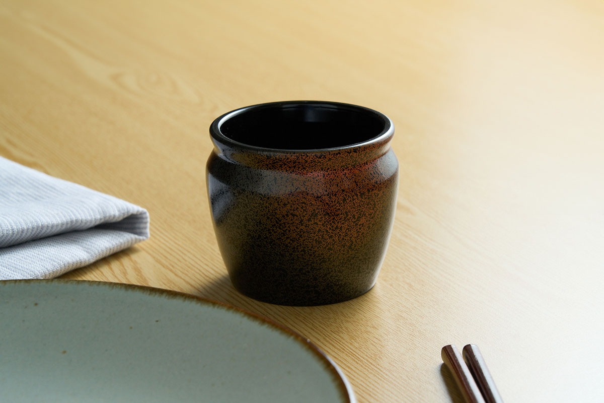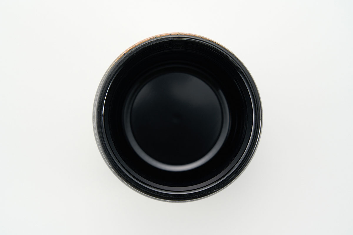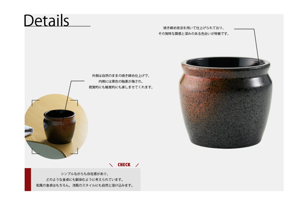 外側は自然のままの焼き締め仕上げで、内側には黒色の釉薬が施され、視覚的にも触覚的にも楽しませてくれます。