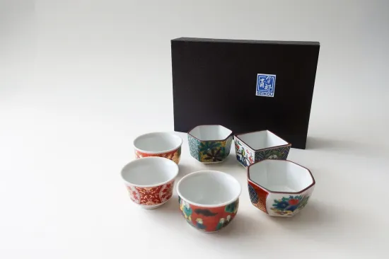 同じく青郊窯で作られた「組盃揃 久谷歴代画」は、古九谷や吉田屋風など伝統的な画風が楽しめる盃のセット。