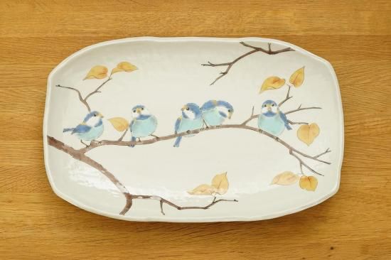 木の枝に止まった山雀のイラストが愛らしい九谷焼の盛り皿です。