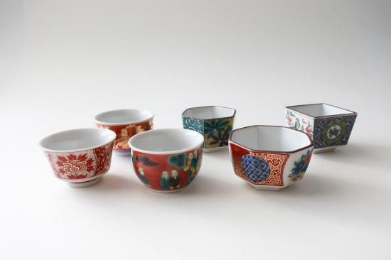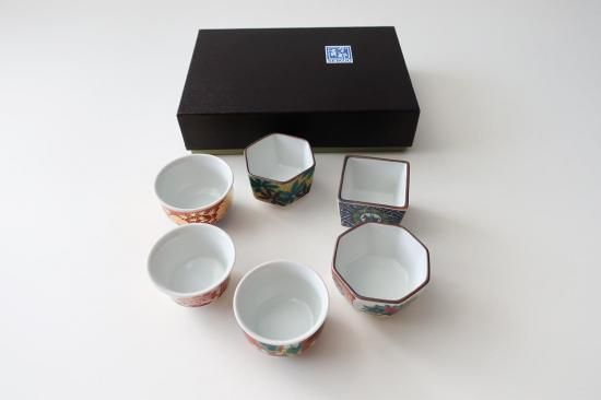 その九谷焼伝統の「古九谷、吉田屋、赤絵」などの歴代画が楽しめる、盃のセットです。