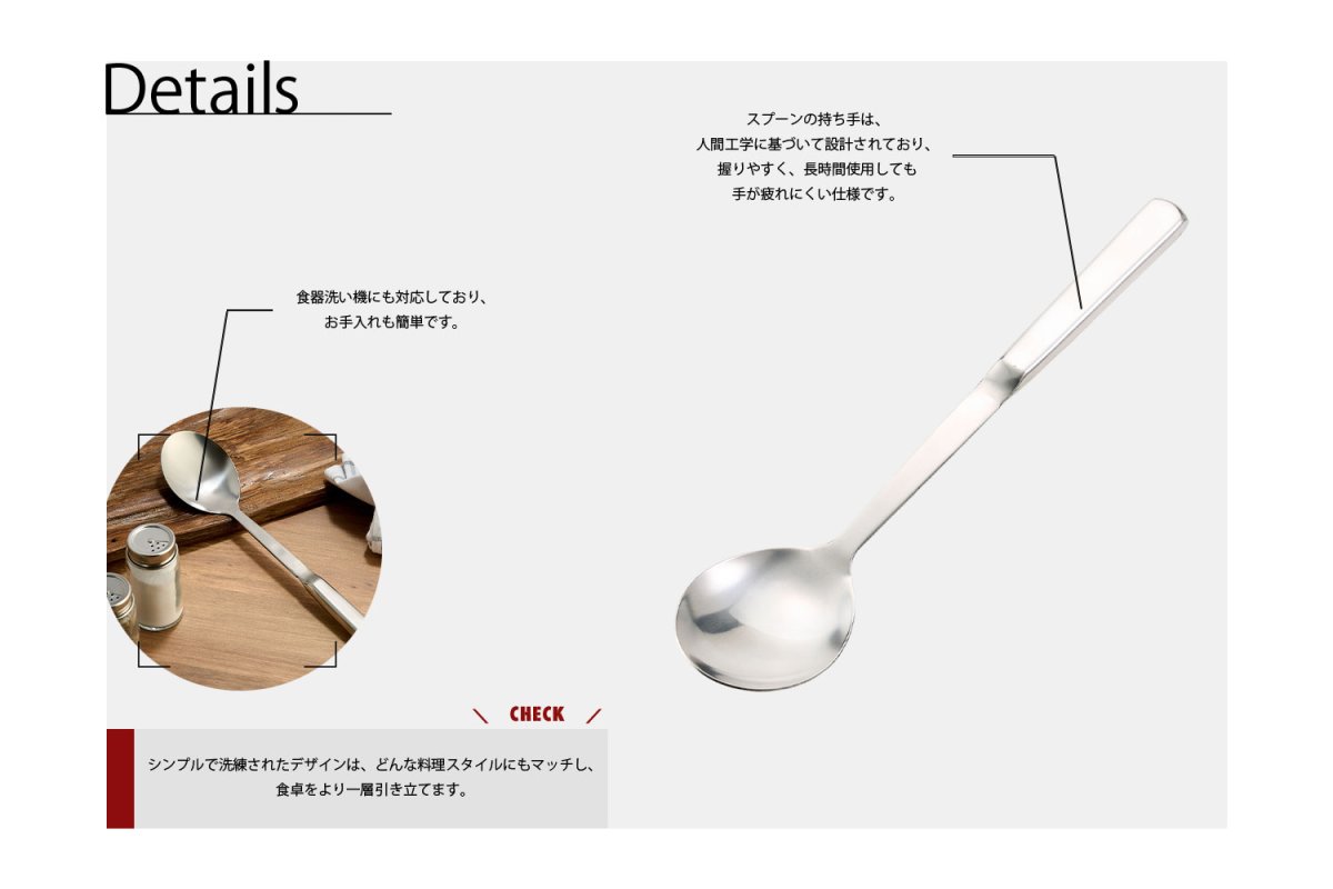 スプーンの持ち手は、人間工学に基づいて設計されており、握りやすく、長時間使用しても手が疲れにくい仕様です。