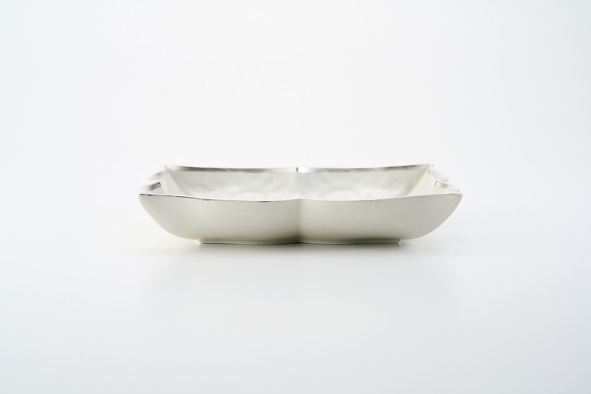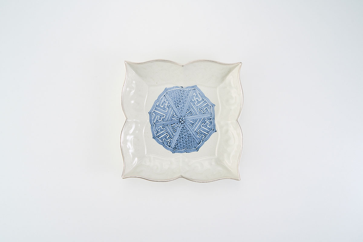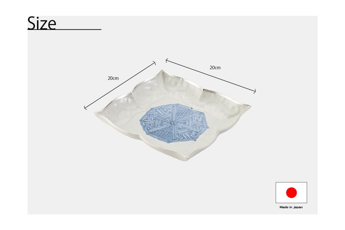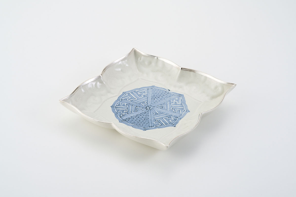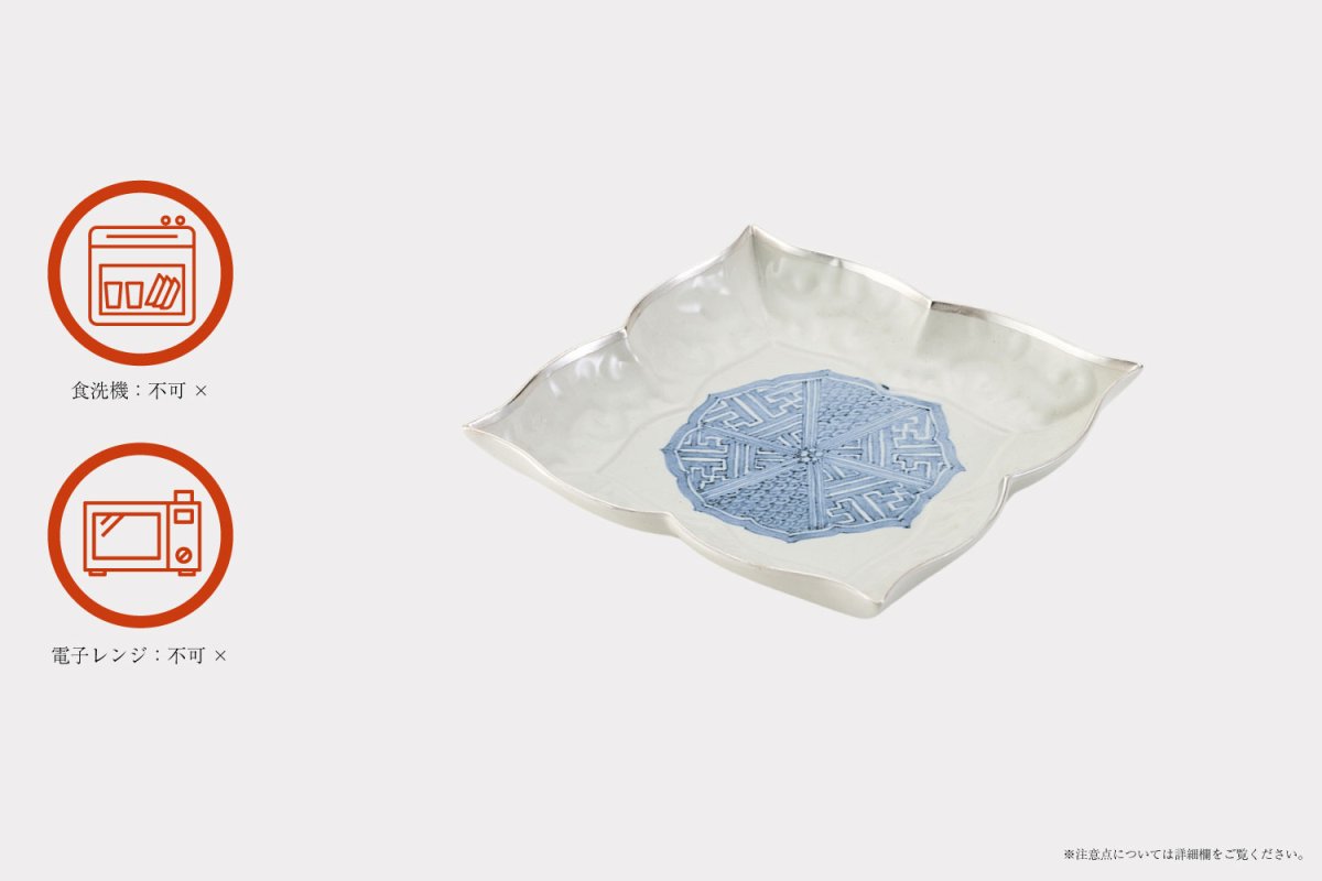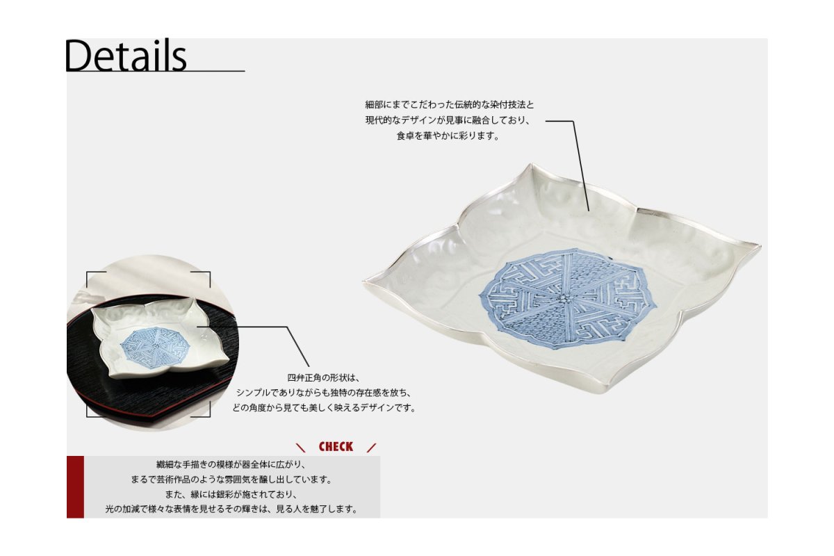 ※こちらの商品は四弁正角向付染付間取地紋縁銀彩のみの販売となります。