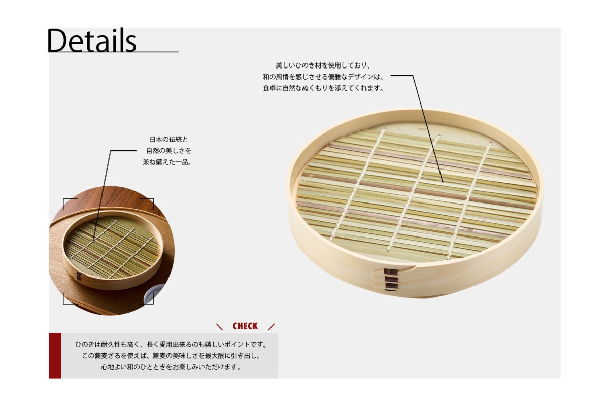 また、ひのき独特の香りと質感を楽しむことができるだけでなく、竹スが付いているため、蕎麦の水切りがスムーズに行えるなど利便性が良いのも魅力。