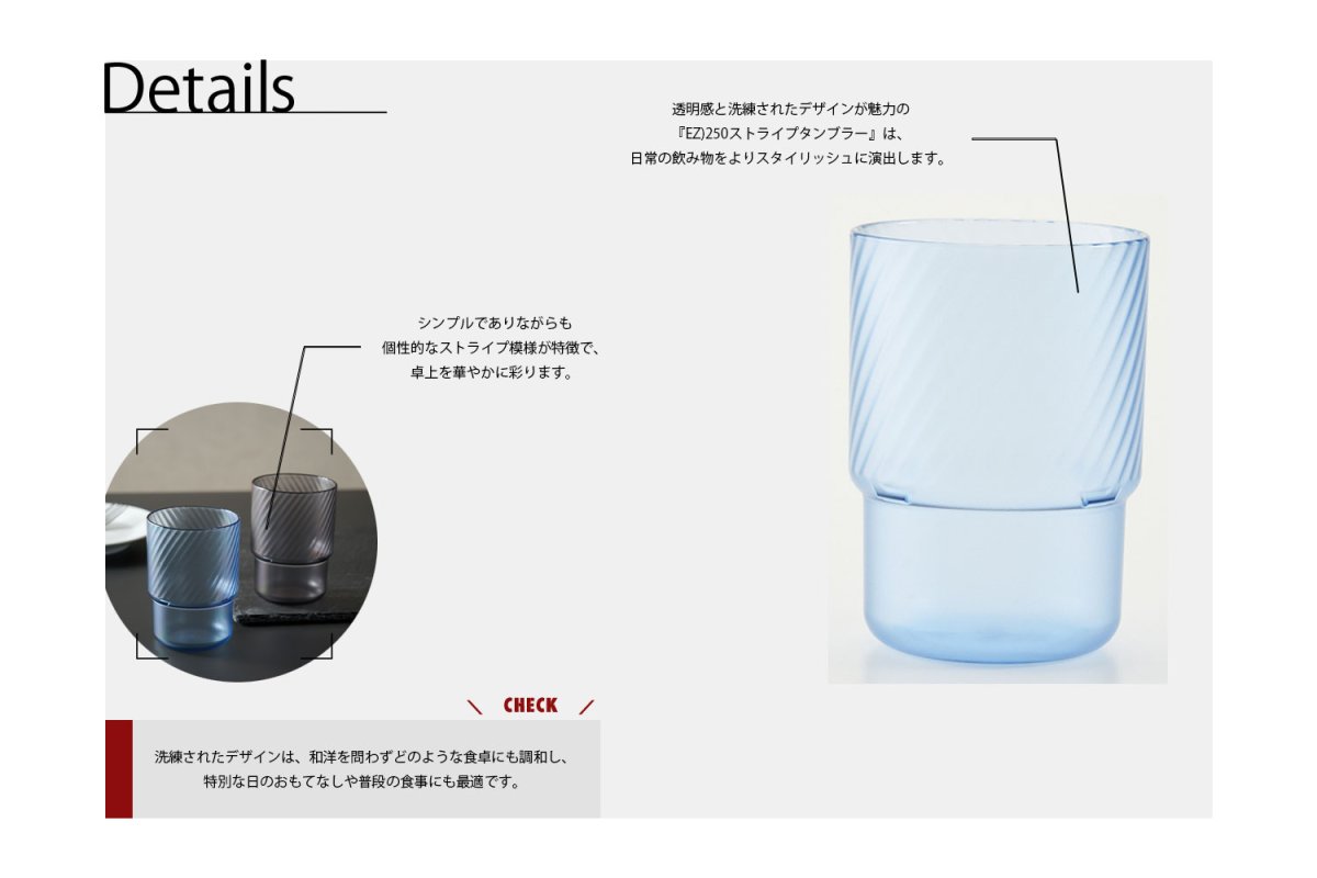 透明感と洗練されたデザインが魅力の『EZ)250ストライプタンブラー』は、日常の飲み物をよりスタイリッシュに演出します。